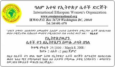 IEWO will launch their newly opened Paltalk Room “International Ethiopian Women's Organization Forum†coinciding with international women's day which will be celebrated this weekend March 8 & 9 in Washington D.C.