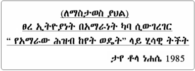 JUNE 1991: Tsegaye Gebre Medhin (aka Debteraw), Yishak Debretsion, Amha Bellette, Sitotaw Hussein (all four members of the Leadership committee of the Ethiopian People's Revolutionary Party (EPRP), and senior members like Teklai Gebre Sellasie, Hagos Bezabih, Desalegn Amsalu fell into the hands of the Tigrai People's Liberation Front (the ruling TPLF/EPRDF), were taken to Bahr Dar prison and then to Tigrai and "disappeared". Around the same time, the Sudan deported the refugee Azanaw Demile and he has also disappeared. Read More>>> Press Release