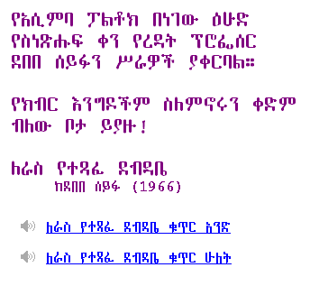 Entire audio interview recording of Dr. Wondimu Mekonnen, a special guest at Assimba PalTalk Room “Patriots Day (Ager Wodaoch Qen)” on Saturday April 21, 2007 , discussing the current Ethiopian political situation, united front and Ethiopian Millennium.