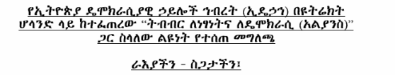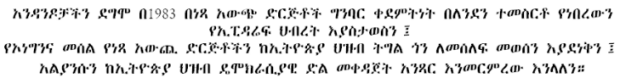 The Ethiopian people have always been observant of their responsibilities in supporting the state and any opposition force that promised them a better life. They have always borne all the costs caused by the bureaucracy hoping to get education, medical care, and an improvement in their living conditions. They defended the country with all they possessed including their lives. However, Ethiopia has become an example of poverty, civil wars, famine, AIDS and Malaria epidemic, violations of human and democratic rights. The long and bloody struggle for liberty and a better life has not yet produced the desired results, which still has not discouraged the people from pursuing the same goals. ....Read More..>