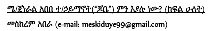 This article is written exclusively for the Ethiopian and Eritrean Youth who were born in 1986 and are currently going uphill, the hill of what is known as AAGMELAGO This is a conceptual trail starting from the bottom of the Red Sea (Eritrean) to the top of the highest mountain Ras Dashen (Ethiopian).