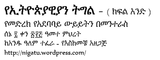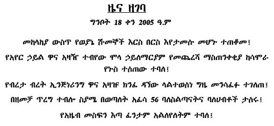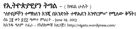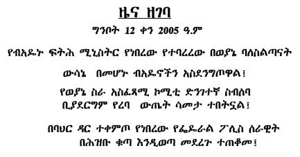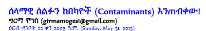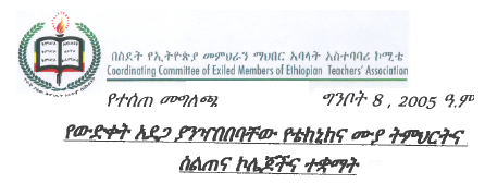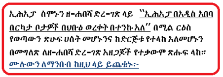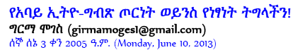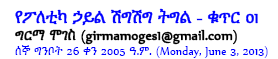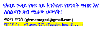 The Amharic version of the Voice of America (journalist Solomon Abate serving as moderator) entertained a discussion on corruption which was broadcast on May 17 and 18, 2013. Participants included Messrs. Mulugeta Aragawi of Addis Ababa University, Abebe Gutta (attorney at law in Addis Ababa), Berhanu Assefa (Ethical Education and Communication Affairs Director of the Federal Ethics and Anti Corruption Commission-FEACC) and I.