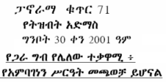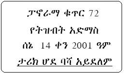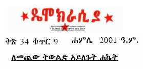 Both Lemma and Tesfaye are veteran members of the EPRP who were also at onetime registered refugees in the Sudan. In 1991, they fell into the hands of the TPLF (now in power) and were taken from Gondar to Makalle,Tigrai, and later released after months of detention. In 1993, they were arrested again in Addis Ababa along with Aberash Berta and disappeared. Their case has been ignored by international human rights groups--no reasons given. As is the case with Aberash, there are justified fears that they may have been killed summarily by the ruling Tigrean Front.
