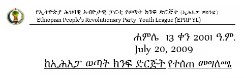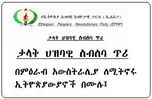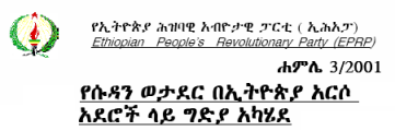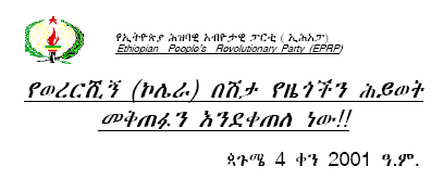 The EPRP strongly condemns the Meles Zenawi regime that has not only exposed the Ethiopian people to a cholera epidemic but has ordered doctors and health officers to deny the epidemic is cholera lest it loses revenue for foreign tourists. Hundreds have died from the cholera epidemic referred to by theregime falsely as "diarrhoea".
