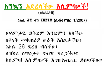 We Ethiopians are rejoicing, wherever we are—in or outside of Ethiopia, at the release on Friday of the Opposition leaders, journalists, human rights defenders, political activists and others from Kaliti prison. July 20, 2007, will forever mark a great day, similar to May 15, 2005 that will go down in history books for all freedom loving Ethiopians, but please remember, as we are celebrating a beginning victory, it is only one battle in a war for justice, freedom, peace and liberty.