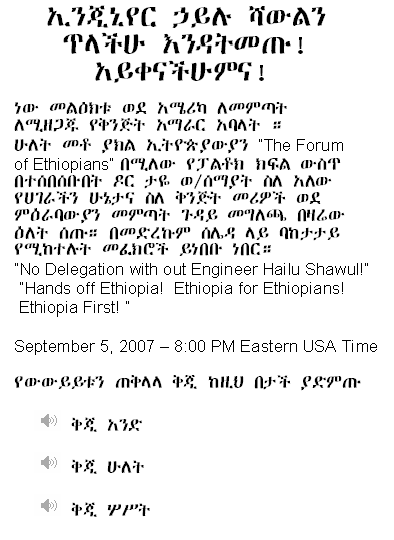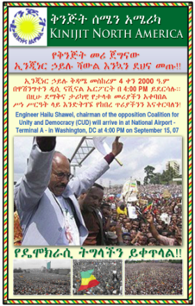 The Delegation to the U.S. will include Ato Hailu Shawul, Chairman of CUD, W/T Birtukan Midekssa, Vice Chair, Dr. Berhanu Nega, Addis Ababa Mayor-Elect and members Dr. Hailu Araya (Spokesperson), Ato Brook Kebede and Ato Gizachew Shiferaw.