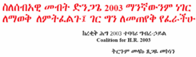 Ethiopians residing in San Francisco area are urged to contact Speaker Pelosi's district office by phone 415-556-4862 or fax 415-861-1670 and seek support for the passage of H.R.2003.