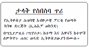 Indian Ocean Newsletter (No. 1292, 09/11/2010): On 1st September this year, stickers carrying the logo of the opposition organisation Ethiopian People’s Revolutionary Party (EPRP) and a slogan in the Amharic language calling to step up the fight against the TPLF (hard core of the governing coalition) appeared simultaneously at several places in Addis Ababa. They could be seen on the walls of the university, taxis and minibuses, at the main bus station and the market, in bars and restaurants and even on electricity pylons. The very next day, the head of security services, Getachew Assefa, gathered his agents in charge of surveillance of this illegal organisation and gave them a dressing down, asking them to remove the stickers as quickly as possible. It was at least two years since the last time the EPRP distributed leaflets in Addis Ababa