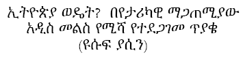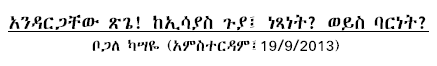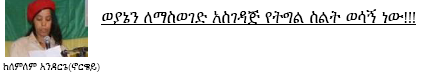 This coming Sunday Sept 22 in Arlington, Virginia Ginbot 7 has called all   Ethiopians for open public dialogue. On this public meeting  Ginbot 7 chairman,   Dr. Birhanu Nega and the Secretary, Andargatchew Tsige will be there. This is   the “Mother of all Meetings”. Hope it will be aired live on ESAT.