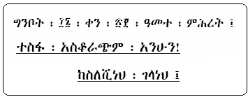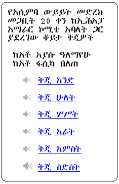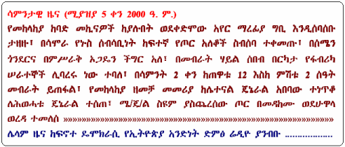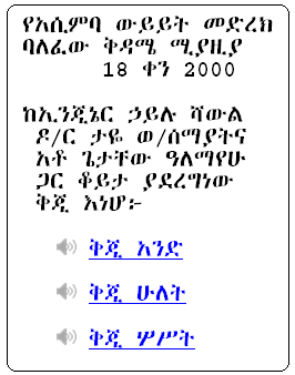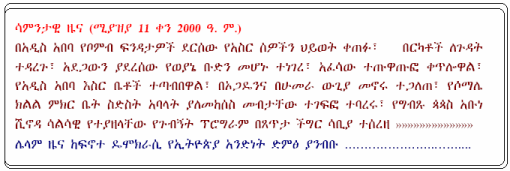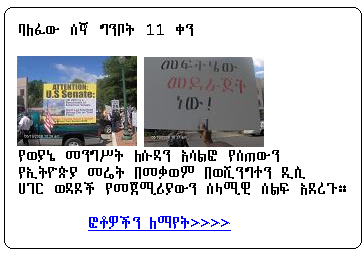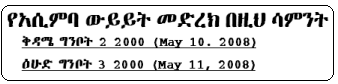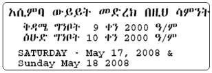 A suggested schedule with a daily emphasis for the Ethiopian Days of Focus on the future of all of us Ethiopians coming up on May 15 –18, 2008:|