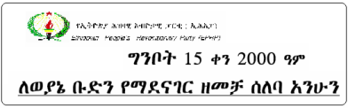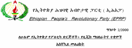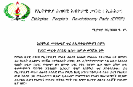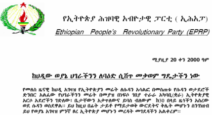 The EPRP joins the people of Ethiopia in raising its voice against the illegal occupation of Ethiopian land by the Sudan. We are saddened to learn that Sudanese soldiers have not only entered Ethiopian territory but have taken brutal action against Ethiopian farmers. Some 30 Ethiopian farmers have been kidnapped and taken to prison in the Sudan where reliable reports affirm that they are being starved and denied medical care. This is unacceptable and illegal.
