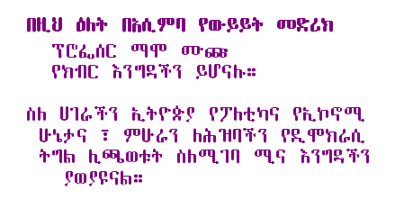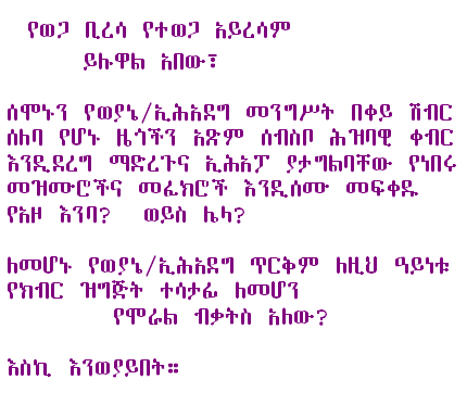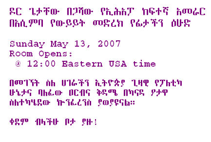On this day : Dr. Taye W.Semyat of ETA and Ato Kifle Mulat of free press will be in our room to discuss their recent call to all opposition groups in the Diaspora, religious leaders, civic organizations and known individuals and elders for a national conference of unity that will galvanize Ethiopian people to struggle for democracy justice. We will have an in-depth discussion of the current political situation of the country and what their call all means. |