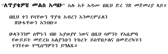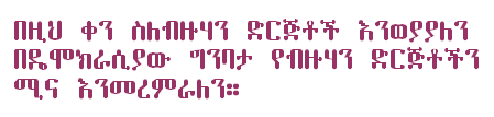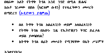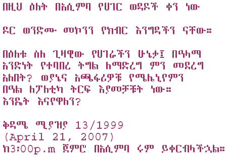 Happy New Year : This is a free mic day in our room. Make your own agenda, discuss on current political events of Ethiopia. Bring in all your collections of poems, recorded speeches, songs and etc. etc…Let us have creative pre New Year Eve! |
