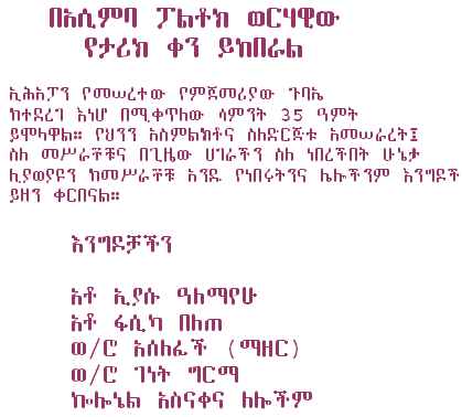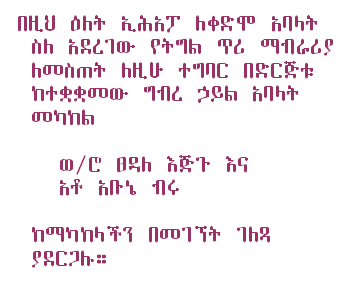 Last Saturday of the Month is HISTORY DAY At Assimba Room: We will closely look back into history of that generation’s struggle to empower Ethiopian people. What good things can we keep from the past for our present struggle?We have a special guest: Ato Tegegne Moges. He will take us through his years of struggle, from Ethiopian Teachers' Association, to "Shengo" ( Ethiopian Parliament ) membership to EPRP. We will take a trip with him to closely look at that generation’s sacrifice and drive to bring revolutionary change to Ethiopia. |