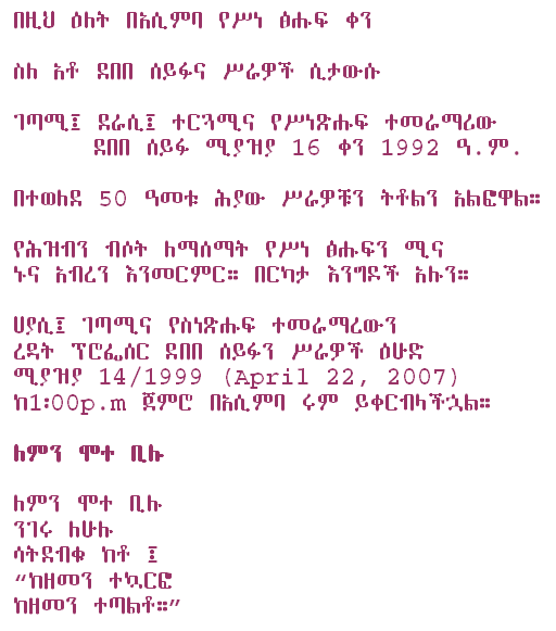 This is a free mic day in our room. Make your own agenda, discuss on current political events of Ethiopia. Bring in all your collections of poems, recorded speeches, songs and etc. etc…Let us have creative day! |